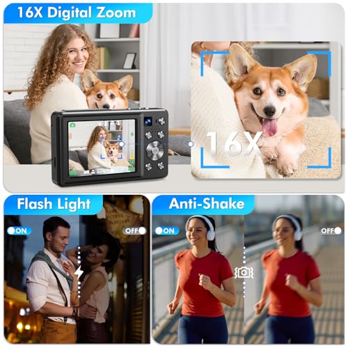 【16X Digital Zoom & Multifunctional】- Get closer to your subject with 16X digital zoom. Frame your shots easily on the bright and clear 2.8-inch IPS display. This compact digital camera also works as a webcam, it supports recording while charging, so you’ll never miss a moment. The pause function allows you to pause recording easily.