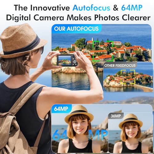 4K Digital Camera, 64MP Autofocus Vlogging Camera with Dual Lens, 16X Digital Zoom YouTube Compact Travel Point Shoot Camera for Teens Beginner, Anti-Shake,2 Batteries, 32GB Card (Black)