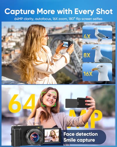 4K Digital Camera for Photography, 2026 Latest WiFi 64MP Vlogging Camera for YouTube with 180° flip Screen, Autofocus Anti-Shake, 16X Zoom, Compact Travel Camera, 32GB Card, 2 Batteries, Black