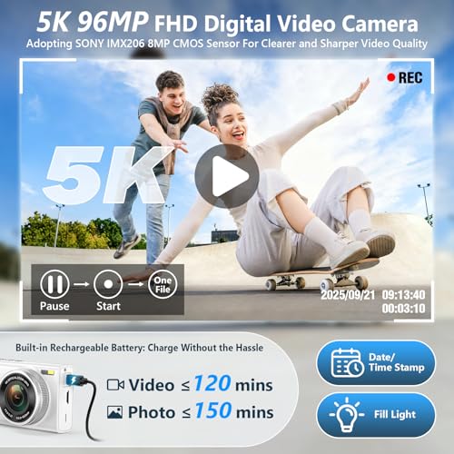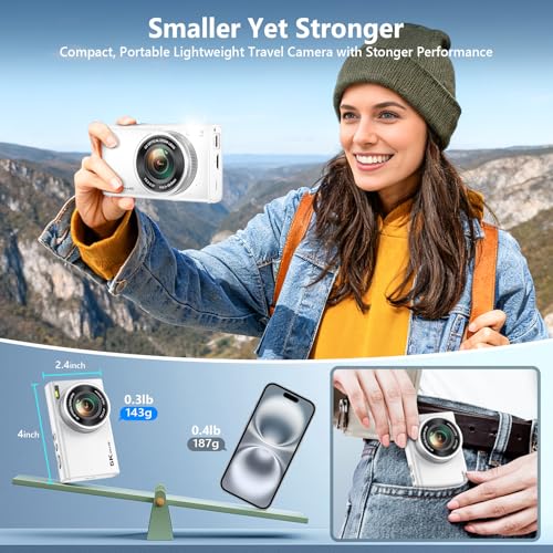UPGRADED 5K 96MP DIGITAL CAMERA: Equipped with IMX415 CMOS image sensor, the 5K digital camera for photography can capture true 5K(5120×2880) video and up to 96MP(11264*8448) images with incredible details and vibrant natural colors. Combined with anti-shake and a built-in flashlight, the digital point and shoot camera effectively ensure stable, clear pictures even in low-light or fast-action conditions.