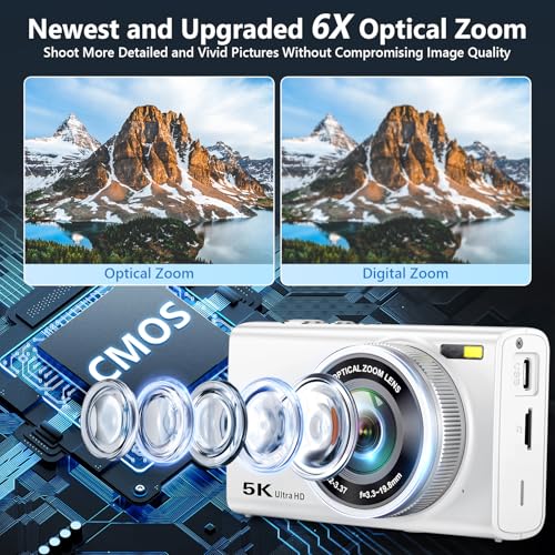 5K Digital Camera for Photography with 6X Optical Zoom, 2026 Latest 96MP Autofocus Vlogging Camera for YouTube with Dual Lens, Anti-Shake, Flash, Compact Small Travel Cameras with 64GB Card, White