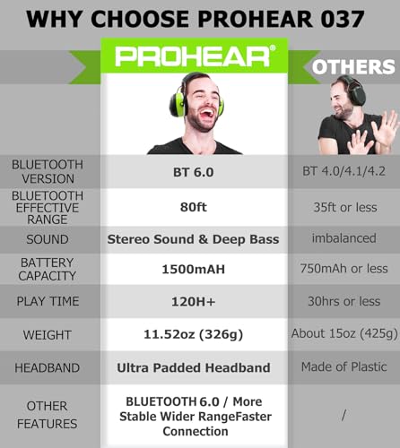 PROHEAR 037 is a safety Bluetooth earmuff for hearing protection and entertainment, it is the most Cool & Unique gift for your family and friends . With a high capacity lithium rechargeable battery, long battery life, comes pre-charged and ready to use. Bluetooth 6.0 wireless technology, allows you to move easily during work, helping you focus on and enjoy your workday. Wired + wireless, support aux audio jacks, suitable for extremely noisy environments such as wood cutting, snow blowers, leaf blowers, buildings, etc. Stereo sound enhances the sensory experience, and integrates a microphone to make hands-free calls. And UPGRADE BLUETOOTH 6.0 TECHNOLOGY allows you can let go of your hands, even at 80ft. Super soft telescopic height adjustment headband with replaceable foam ear pads, customized fit. THERE NO NEED TO WORRY. PROHEAR PROVIDE ONE YEAR WARRANTY. PROHEAR is committed to providing the best service for you. If you have any comments or suggestions on our products or services. Please feel free to contact us.
