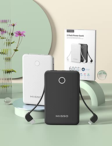 6000mah Ultra Slim Built in Cables Power Bank, Card Size Built in USB C Cords Battery Pack Portable Charger for Phones, 3 Output External Battery Pack Compatible with iPhone, 2-Pack Black & White