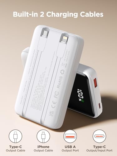 PORTABLE CHARGER WITH BUILT IN CABLE: This Power bank has 2 built-in cables(iOS and Type C cables) and 2 ports(Type A output and Type C input/output Ports), making it compatible with 99% of smart devices on market such as Samsung Galaxy S24 S23 S22 S21 S20 series, iPhone 16 15 14 13 12 11 Series, Tablets, Headphones and etc.. Charging up to 4 devices simultaneously(can use the A-C Cable in the package as well!). No more tangled cords and bulky chargers, this portable charger will be your best travel companion Ever!(Airline-approved). Please note: The adaptor is not included