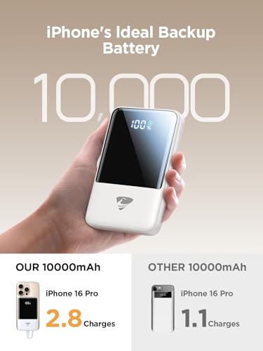 ULTRA-COMPACT DESIGN: With this 10000mAh power bank, you may charge iPhone 16 pro about 2.8 times, a Google Pixel 9 about 2.1 times, all these power has been compressed into a compact body which weighs only 209g/0.46lb. The dimention of this slim power bank is 110mm*69mm*17.5mm/4.33″*2.72″*0.69″, smaller than most smart phones! Whether you’re traveling, hiking or just chill in a bar, this will be a reliable phone backup battery bank to keep your device in power all the time