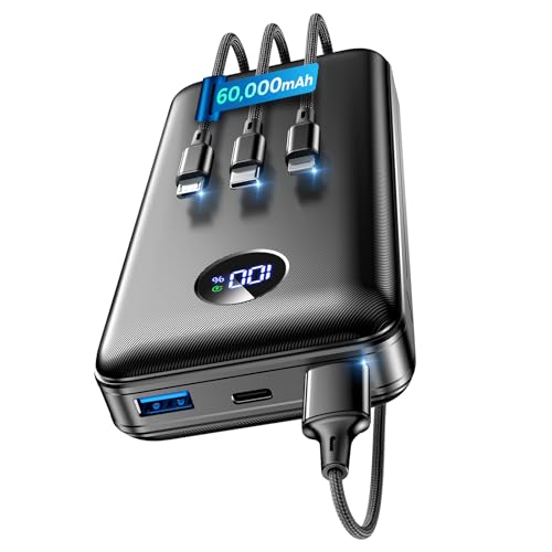 Portable Charger Power Bank – 60,000mAh Battery Pack, 22.5W Fast Charging Phone Charger Attached USB-C/iOS/Micro-USB Cable, Powerbank for iPhone 17 16 15 14 13 Samsung, for Travel Camping Essentials