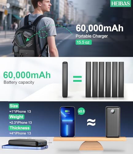 [Large Power Bank Capacity]: The 60,000mAh portable charger with 1,000+ charge cycles (80% capacity retained) for lasting reliability. It’s smart LED display shows precise 1% charge status—no guessing on power levels. From blackouts to storms, the HEIBAS powerbank keeps you powered through crises.