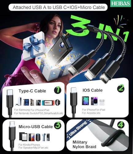 [Charge 5 Devices at Once]: Includes a 3-in-1 cable (USB-C, Lightning, Micro USB)—industrial-grade nylon-braided for tough durability and fray resistance. This versatile 3-in-1 cable is the key to the HEIBAS battery pack charging 5 devices simultaneously: phone, tablet, game console, headphones, even a fan. Essential for camping, travel, festivals, and multi-gadget homes!