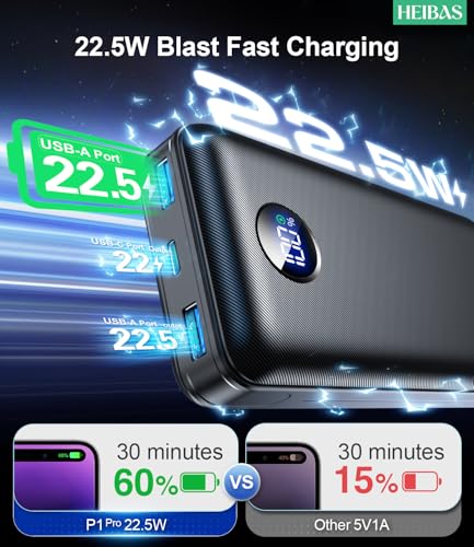 [4X Fast Charging Power bank]: This 3-port phone charger hits 22.5W fast output (18W input), charging 4x faster than old charging banks to boost efficiency. HEIBAS portable power bank supports PD, QC, and more protocols—fully compatible for iPhone 16/15, for Samsung Galaxy, for Google Pixel, tablets, etc. The hassle-free charging solution you need.