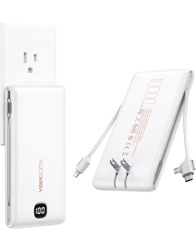 VEEKTOMX Portable Charger with Built in Cables 10000mAh, Power Bank for iPhone with AC Wall Plug, Fast Charging USB C Slim Battery Pack with LED Display Compatible with iPhone 17/16/15/14, Samsung