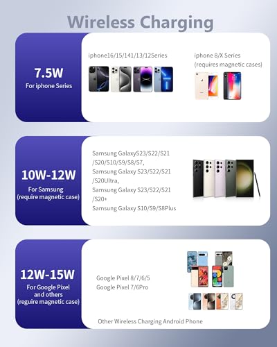 Wireless Charging (Up to 15W): Fast magnetic power bank is compatible with iPhone 17/16/15/14/13/12 series, our magnetic portable charger can provide 5W, 7.5W, 10W, and 15W charging power (7.5W for iPhone).