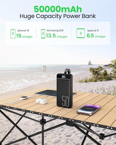 High Capacity 50000mAh Power Bank: The 50000mAh portable charger ultra-high massive capacity charging bank provides 15 charges for iPhone14, 13.5 times for Samsung S20. Depending on battery size, most smartphones will get over 10 full charges. Suitable for camping, hiking, fishing vacation, travel and other outdoors activities