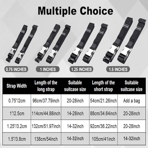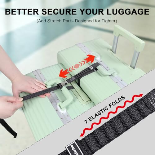 Stretchable Suitcase Straps: Luggage straps for suitcases are including two straps. Both straps are stretchable, they are adjustable in length and tightness. The strechy part can reduce pressure for the straps and buckles. It can tightly bind your luggages together even on bumpy roads or during long travel