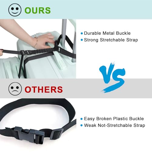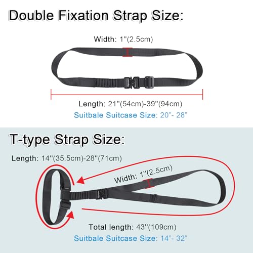 Stretchable T-type Luggage Strap: T-type Luggage strap has two places to adjust the length, secure quick release buckle closure and the stretchy belt can be adjusted to suitable length and tightness. Fit for suitcase size 14″-32″