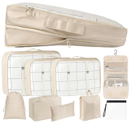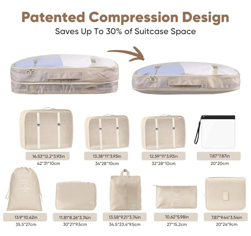 Complete 9-Piece Travel Organizer Set: This all-in-one travel organizer solves all your packing needs. The set features multiple packing cubes including compression bags, a shoe bag, and a waterproof toiletry bag, offering a complete suitcase organizer system to keep your luggage perfectly tidy.