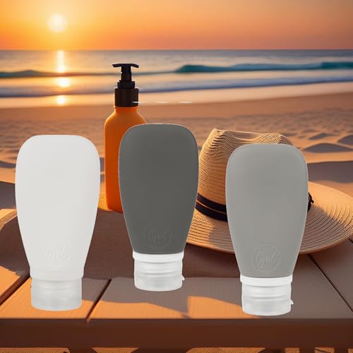 Travel Bottles for Toiletries, TSA Approved 3oz (90ml) Leak Proof Silicone Refillable Squeeze Travel Size Containers BPA Free for Cleansers, Lotions, Shampoo 3-pk (Black-Gray-White)