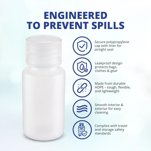 SCREW TOP LEAK PROTECTION TRAVEL BOTTLE: Our leak proof travel bottles are designed as a secure reusable bottles solution with polypropylene lids and liners that help prevent spills and protect luggage. These shampoo travel bottles leak proof options function as reliable travel size bottle and dependable small travel bottles for liquids in any bag.
