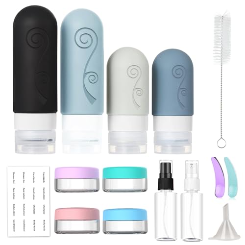 travel accessories and travel essentials: Our 16 pack reusable travel bottles set with 1 toiletry bag , 2 pcs silicone bottles (3 oz/90 ml), 2 pcs silicone bottles (2 oz/60 ml), 2 pcs spray bottles , 4 pcs cream jars, 1 pcs funnels, labels, brush and 2 pcs spatula! Different accessories for your different needs