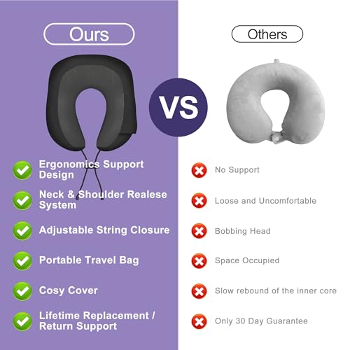 Neck Travel Pillow, Upgraded Memory Foam Pillow for Airplane, Machine Washable, Adjustable Flight Pillow, Suitable for Sleeping Airplane, Car, Office and Home (Black)