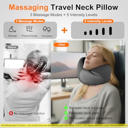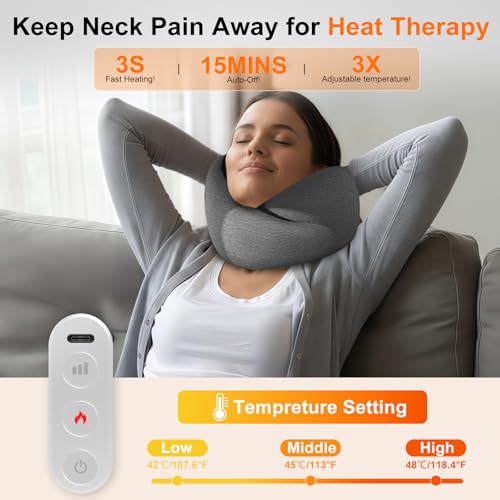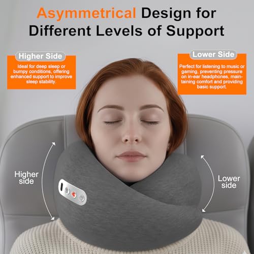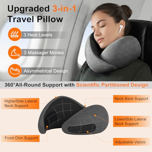 Travel Neck Pillow Airplane 3 in 1 with Heating Massage, Memory Foam Cervical Pillow, 360º Ergonomic Design, Asymmetrical Sides Portable for Airplane Car Office Sleeping Essentials, Breathable Cover