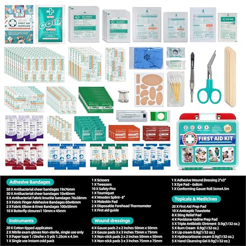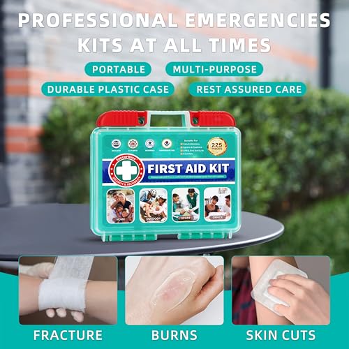 225 Pieces First Aid Kit, Includes Ice Pack, Adhesive Bandages, Wound Gauze Pads, Portable First Aid Bag for Home, Car, Business, Travel, Outdoor Emergency Medical Kits