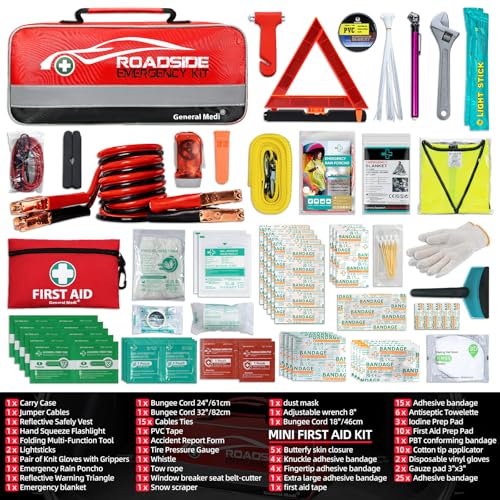 General Medi 127-Pieces Roadside Car Emergency Kit Include Mini First Aid Kit, Jumper Cables,Tow Rope, Bandage, Safety Vest, Emergency Triangle, All in One Pack